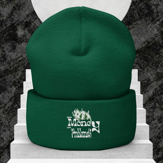 Trendige Unisex Beanie – Umgeschlagen mit 'More Money Less Problems' Design & Grünem Geldschein-Logo – Stylische Streetwear Mütze